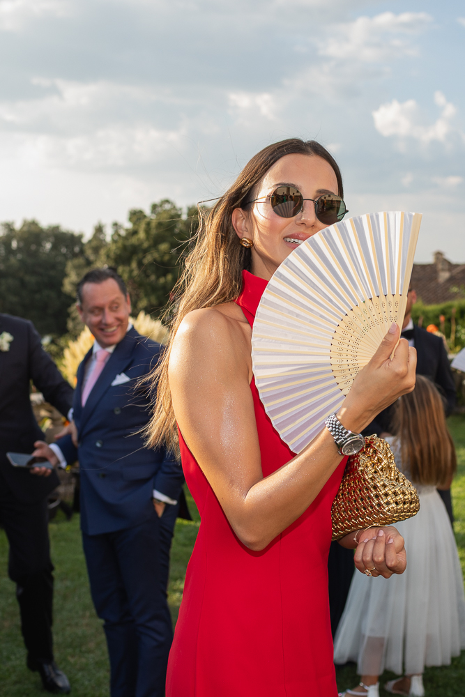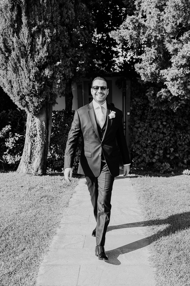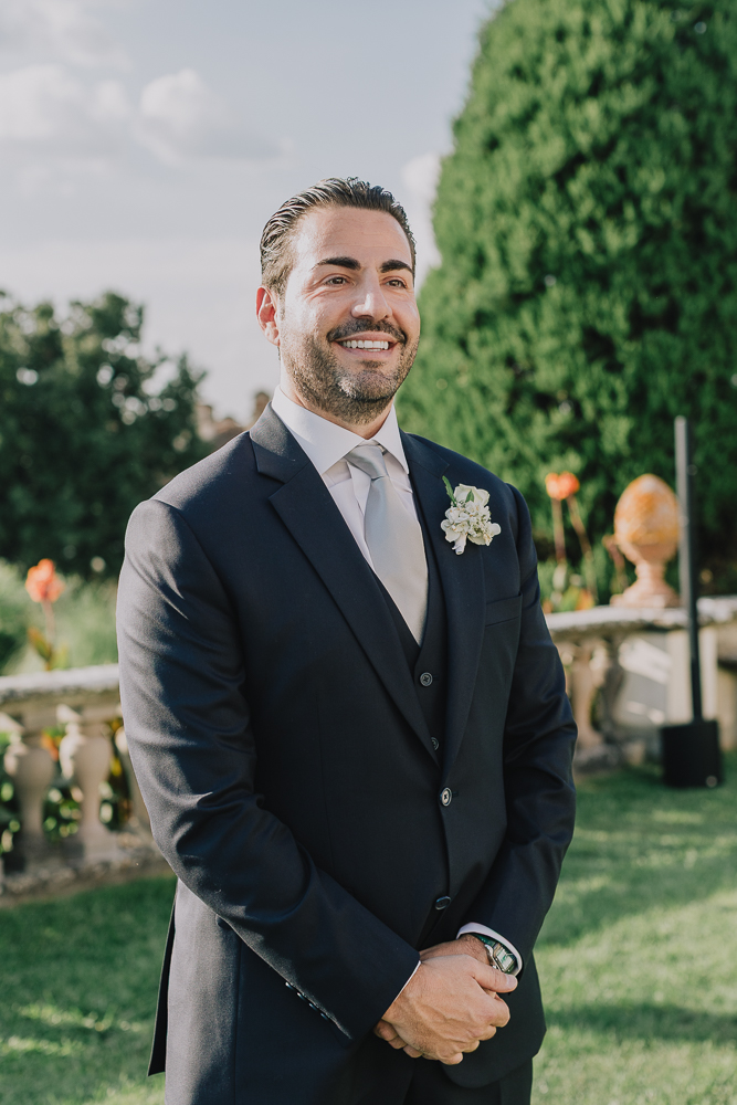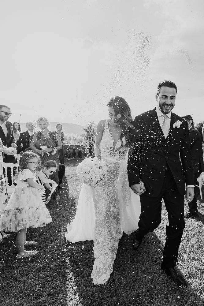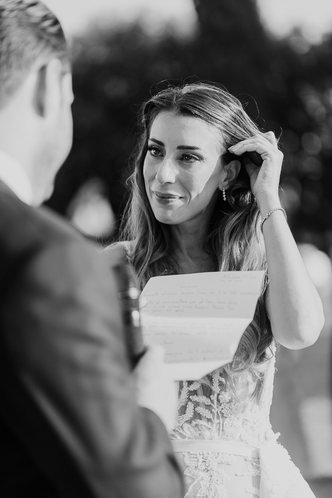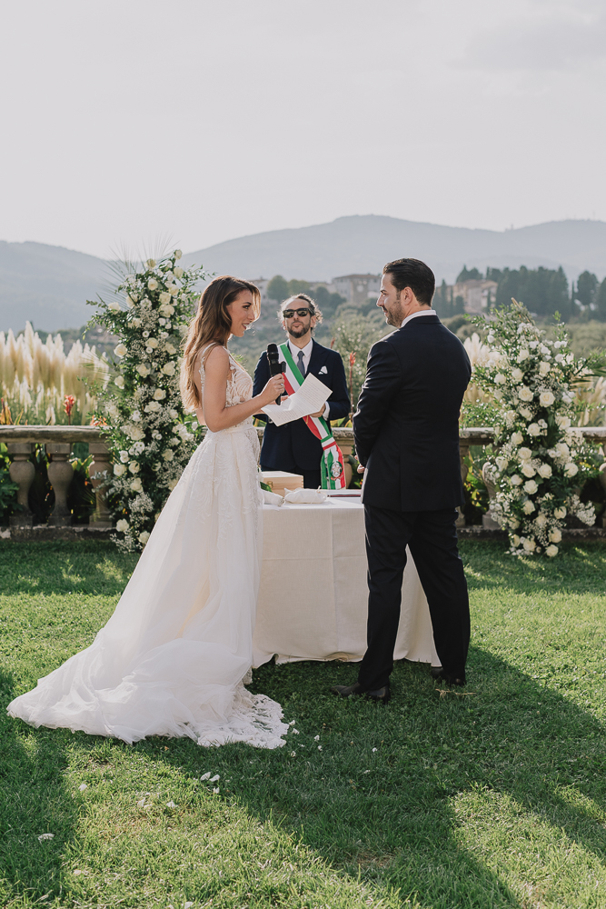 La cerimonia nel giardino della villa è stata un momento di pura poesia, con vista sulle colline e una luce che accarezzava ogni dettaglio.